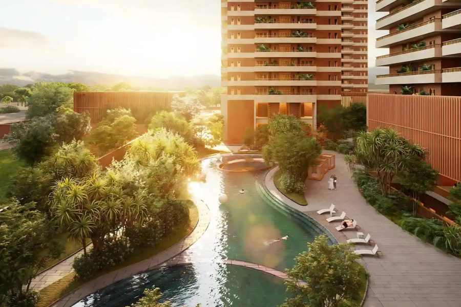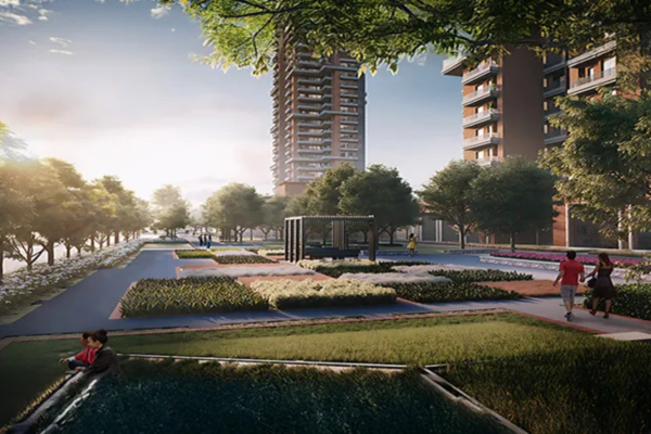 A: The development has amenities like a fitness center, a modern gym, swimming pools, themed gardens, a children’s playground, and a luxurious clubhouse with yoga, meditation, and relaxation areas.